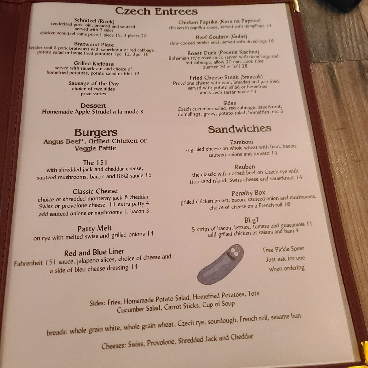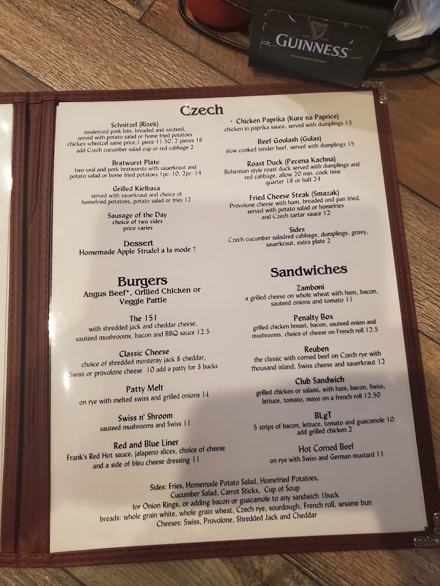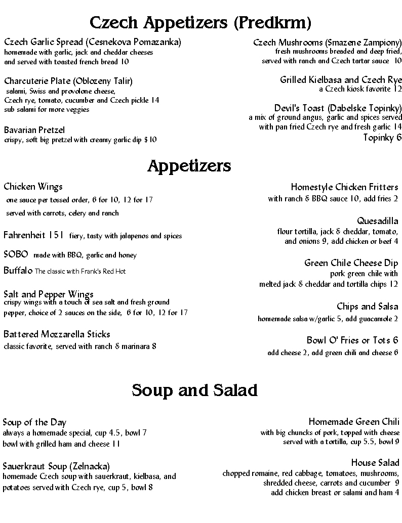 Start with the Soup of the Day, a comforting homemade offering, or enjoy a House Salad bursting with fresh ingredients. The Czech specialties shine with dishes like Chicken Paprika and Beef Goulash, both served alongside soft dumplings—each plate meticulously crafted to highlight the rich culinary heritage.